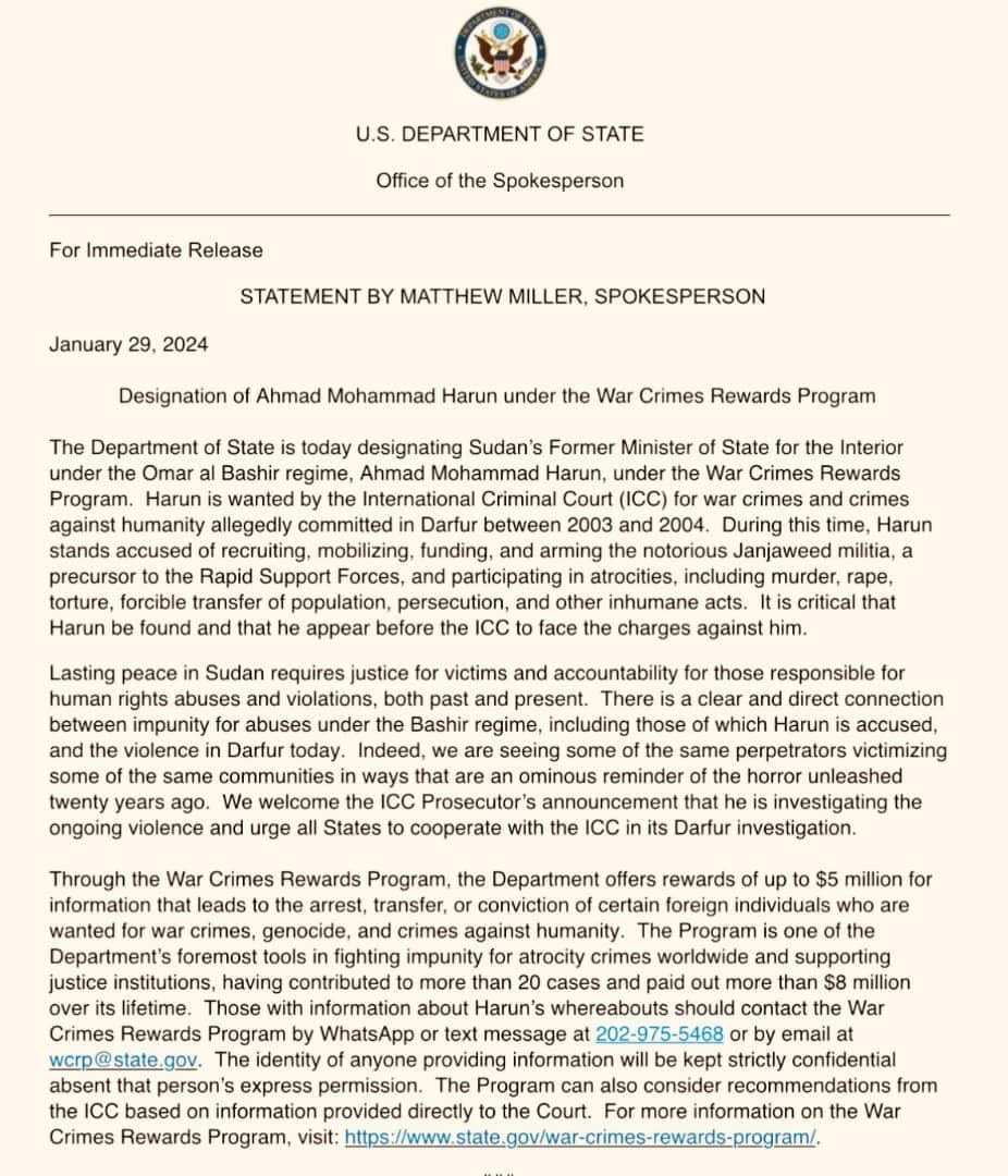 وأضافت الوزارة أن هارون الذي كان وزيرا إبان حكم عمر البشير مطلوب لدى المحكمة الجنائية الدولية لارتكابه جرائم حرب وجرائم ضد الإنسانية يُزعم أنه ارتكبها في دارفور بين 2003 و2004.