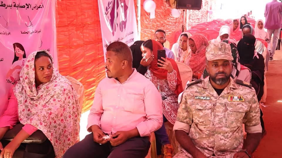 أكد في هذا الجانب المقدم الباقر محمد أحمد ممثل المؤسسة التعاونية أن شهر أكتوبر الوردي هو مخصص للسيدات لشهر كامل والهدف منه زيادة الوعي لمحاربات السرطان في البلاد وجاء هذا العام تحت شعار ” فحصك أمانك ” وقال أن السرطان مرض يصيب النساء َوالرجال وتم وضع له شهر كامل نسبة لخطورته، وأضاف أن في هذا الشهر يتم الفحص المجاني للسيدات