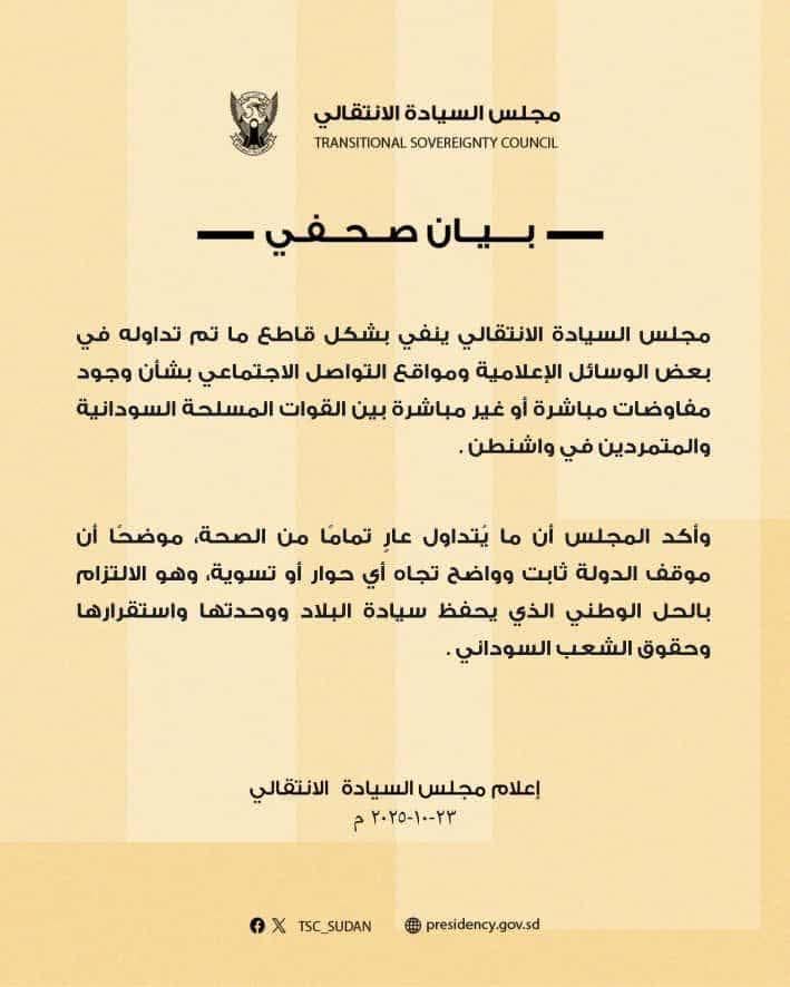 مجلس السيادة الانتقالي ينفي بشكل قاطع ما تم تداوله في بعض الوسائل الإعلامية ومواقع التواصل الاجتماعي بشأن وجود مفاوضات مباشرة أو غير مباشرة بين القوات المسلحة السودانية والمتمردين في واشنطن .