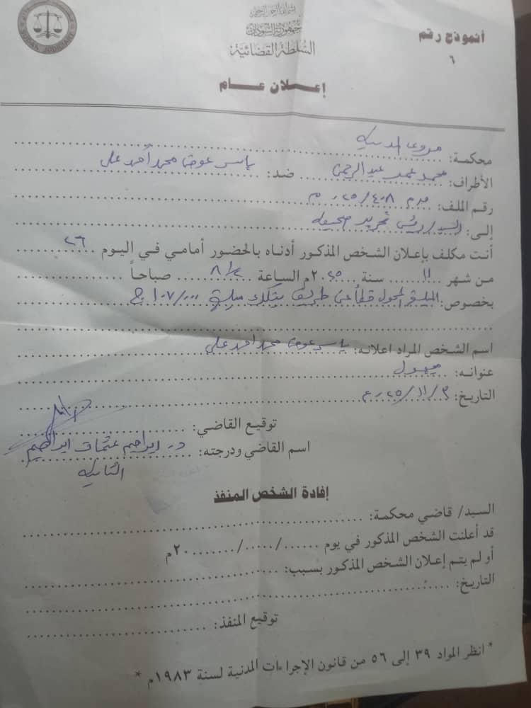 انت مكلف لحضور جلسة يوم ٢٦/ ١١/ ٢٠٢٥م الساعة الثامنة والنصف صباحا لنظر الدعوى الموجهة إليك من قبل / محمد عمر عبد الرحمن بخصوص تحويل خطأ مبلغ ١٠٧.٠٠٠ج( مائة وسبعة الف جنيه) من حساب المدعي بالرقم (1822137) الى حساب المدعى عليه بالرقم (2932279) فإن لم تحضر في هذا الميعاد او تعين لك وكيلا او تبدو عزرا شرعيا مقبولا سمعت الدعوى وحكم فيها في غيابك.