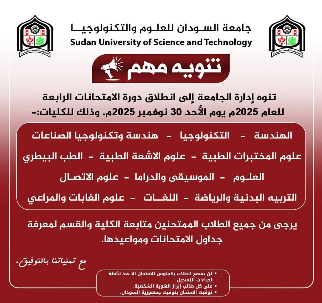 *جامعة السودان للعلوم والتكنولوجيا *أمانة الشؤون العلميـــــــــة *إدارة القبول والتسجيل.. إعــلان هــام*