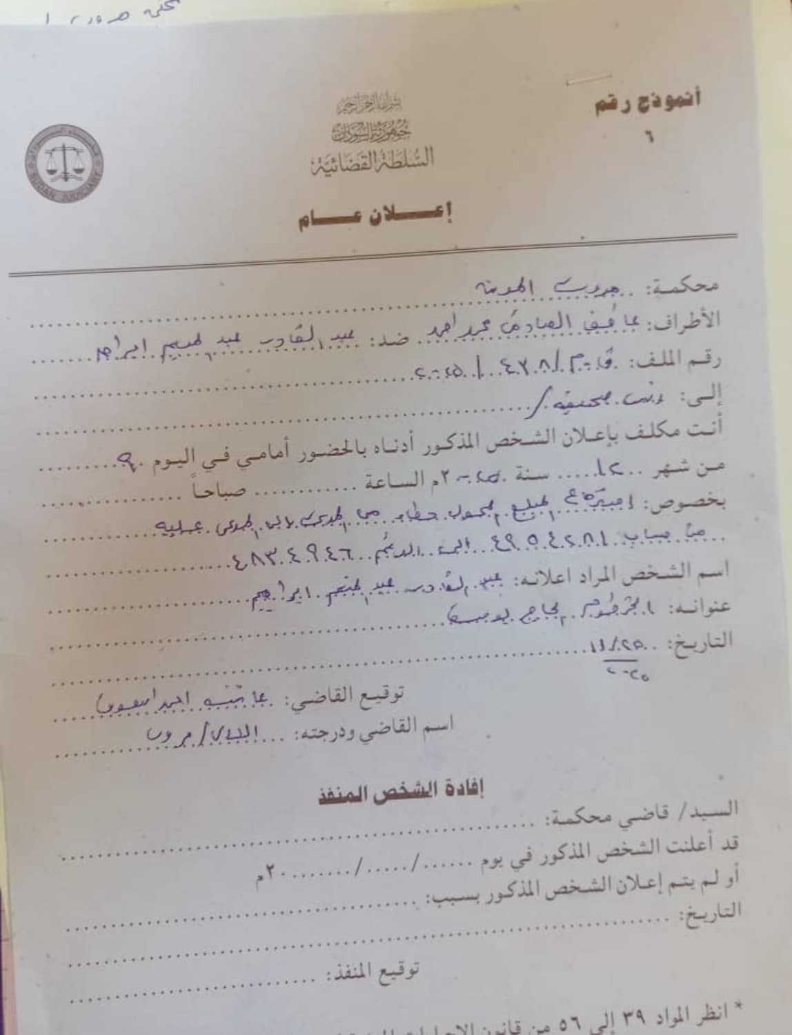 *محكمة مروي المدنية النمرة ق م/ ٩٩/ ٢٠٢٥م التاريخ ١٣/ ١١/ ٢٠٢٥م آمنة البشير محمد خير/ ضد محمد الحسن البشير الموضوع / اعلان بالنشر*