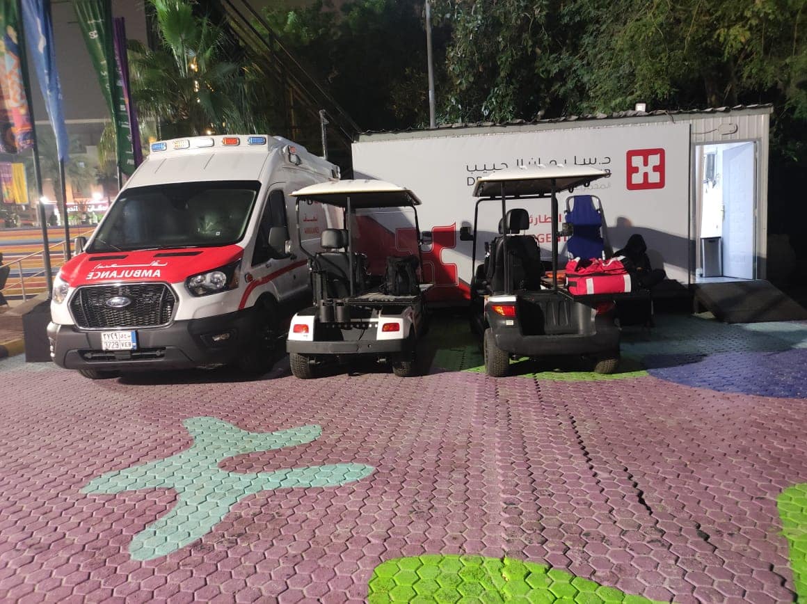 عربة اسعاف وحدة عناية مجهزة نقالات وفرق طبية على اهبة الاستعداد يتواصلون باحتراف عبر اجهزة الاتصال ويتدخلون في اللحظة المناسبة ويمنحون الطمأنينة قبل العلاج .