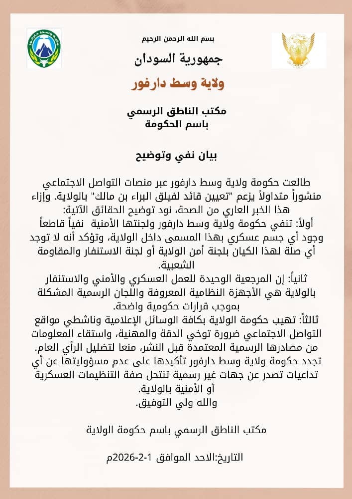 *ولاية وسط دارفور تنفي تعيين قائد لفيلق البراء بالولاية*