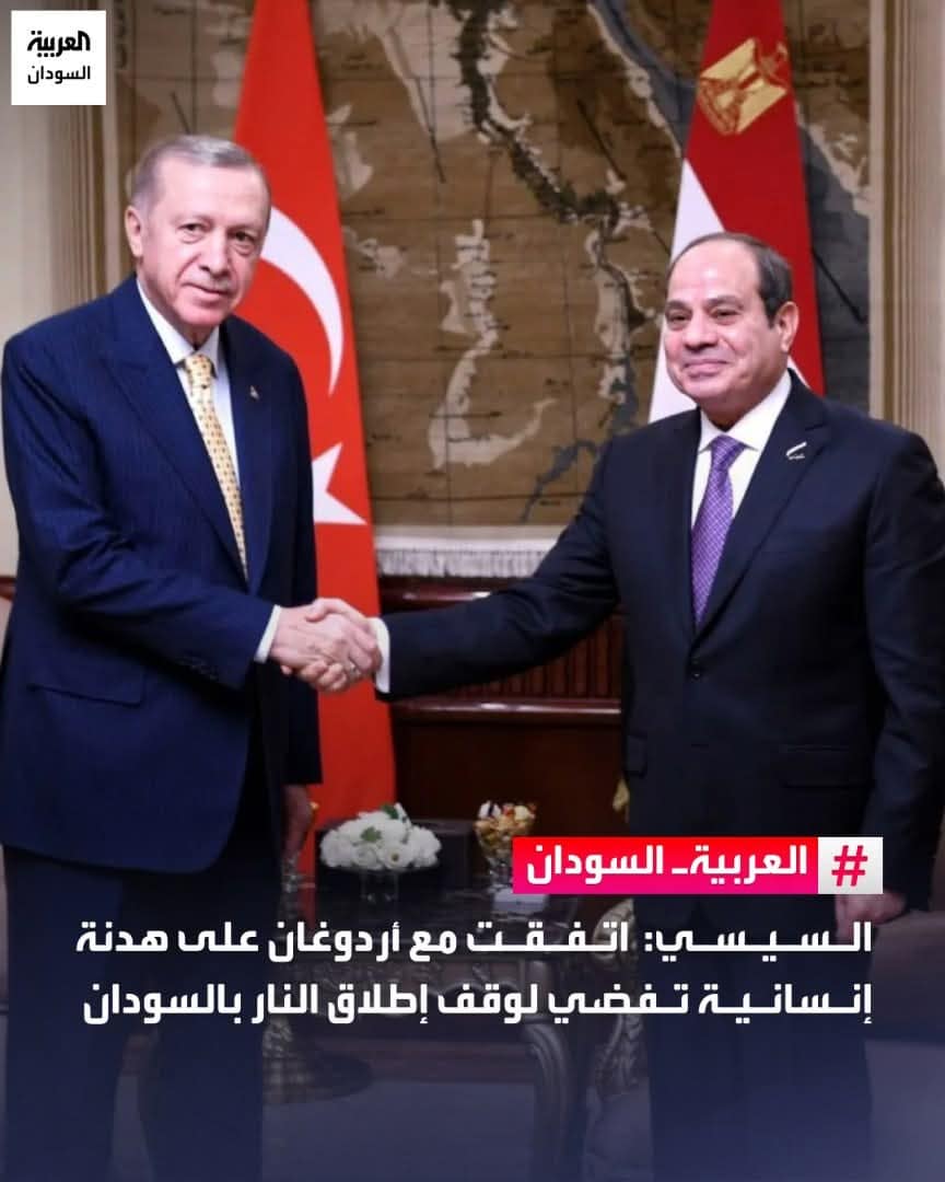 قال الرئيس المصري عبد الفتاح السيسي، إنه اتفق مع نظيره التركي رجب طيب أردوغان على ضرورة التوصل إلى هدنة إنسانية تفضي لوقف إطلاق النار وإطلاق مسار سياسي شامل مع الحفاظ على مؤسسات الدولة الوطنية دعمًا لاستعادة السلام والاستقرار.