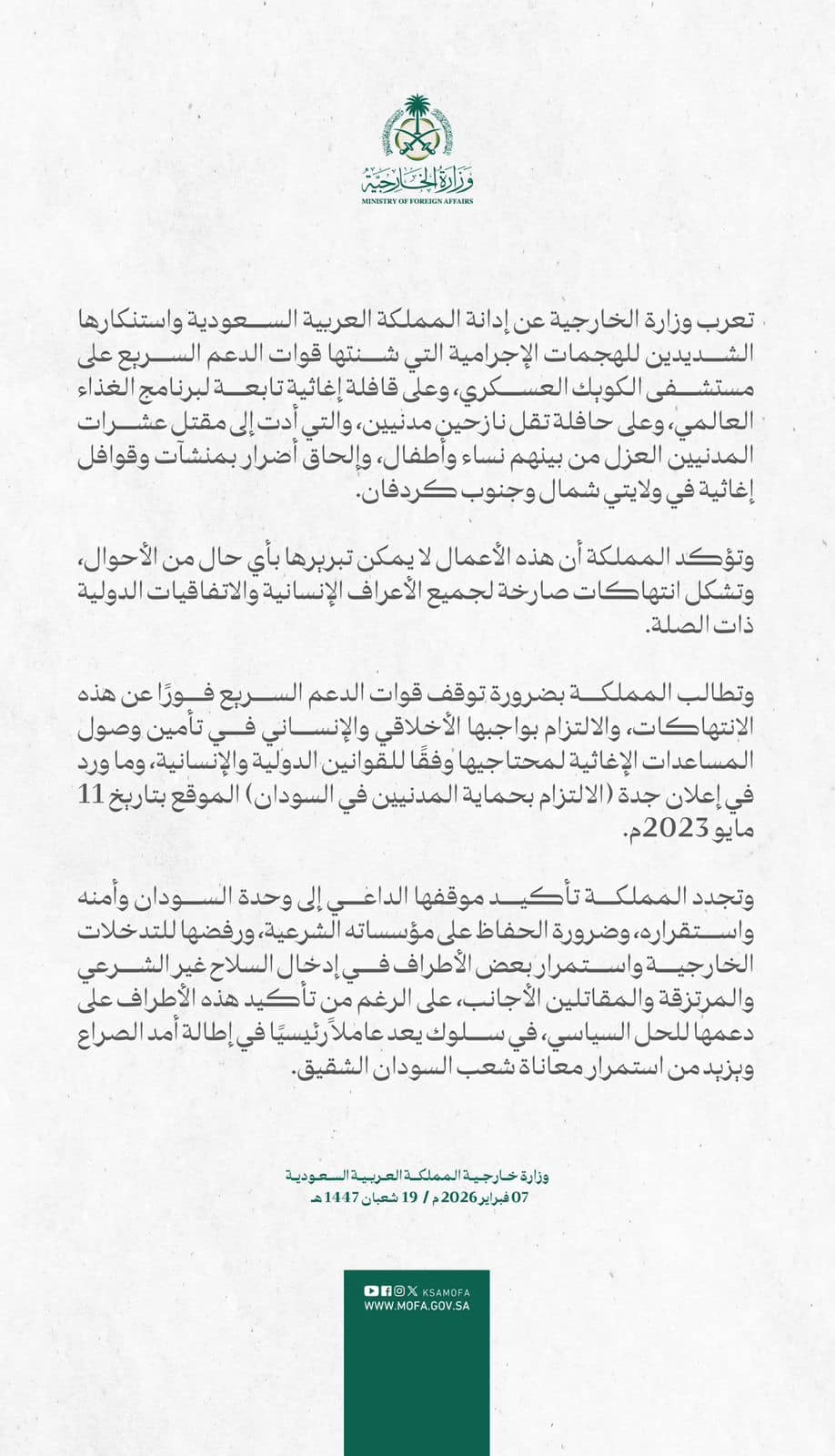 *وزارة الخارجية*: المملكة تطالب بضرورة توقف قوات الدعم السريع فورًا عن هذه الانتهاكات، والالتزام بواجبها الأخلاقي والإنساني في تأمين وصول المساعدات الإغاثية لمحتاجيها وفقًا للقوانين الدولية والإنسانية، وما ورد في إعلان جدة (الالتزام بحماية المدنيين في السودان) الموقع بتاريخ 11 مايو 2023م.