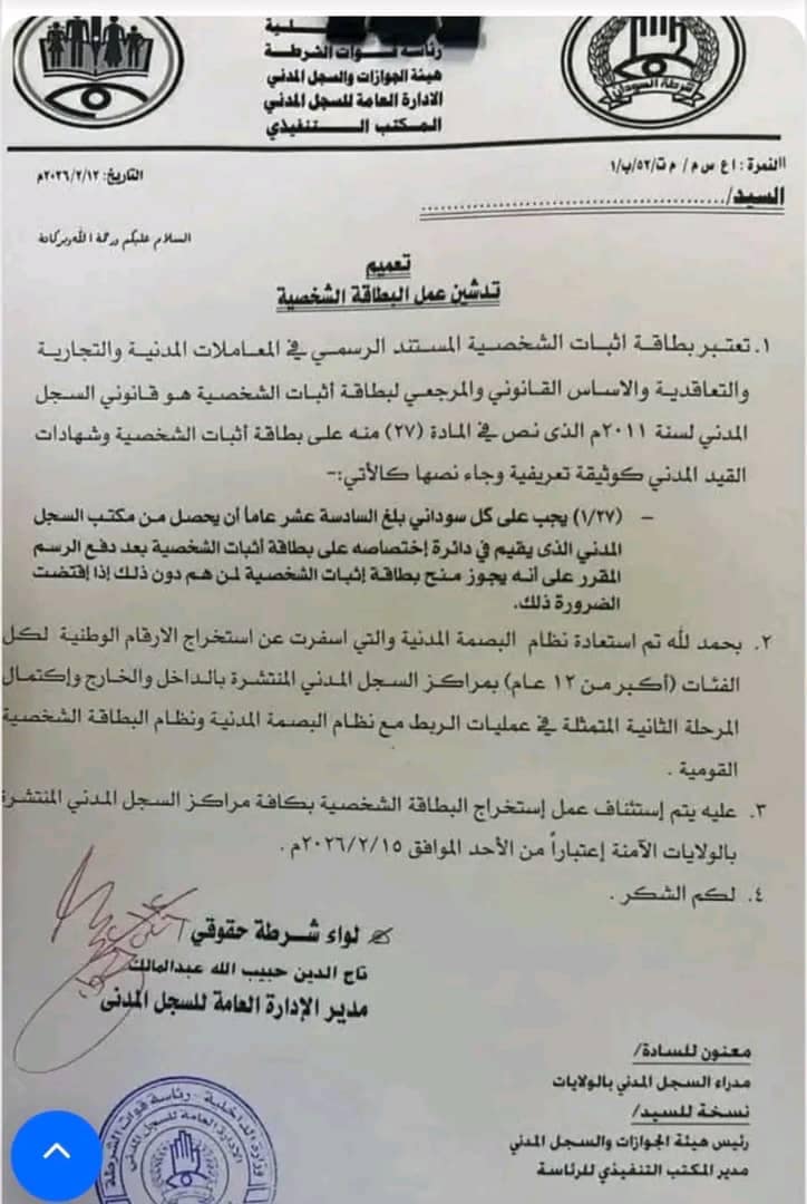 ⭕️ رسميآ واعتبار من اليوم الإدارة العامة للسجل المدني تعلن استئناف عمل استخراج البطاقة القومية بكافة مراكز السجل المدني المنتشرة بالولايات الآمنة