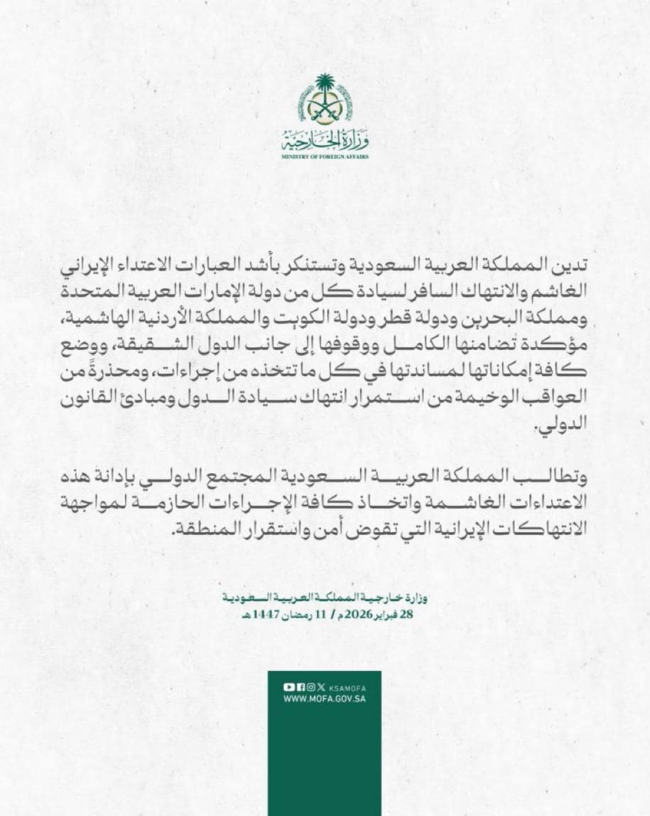 *السعودية تدين استهداف إيران لدول الكويت وقطر والاردن والإمارات والبحرين*