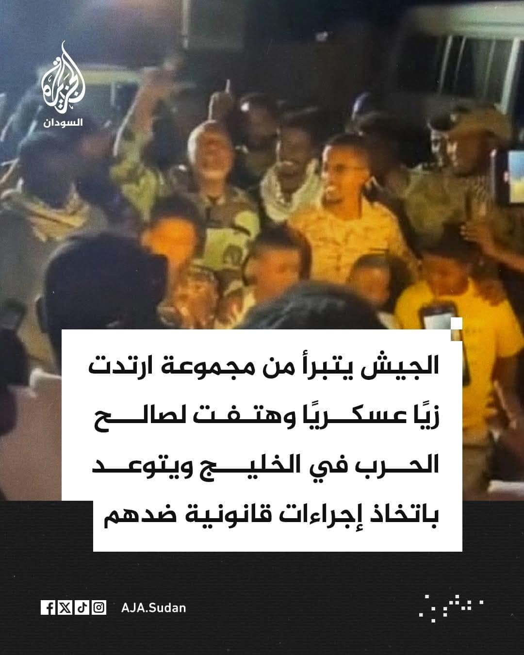 الناطق باسم القوات المسلحة: المجموعة التي ظهرت في الوسائط وهي ترتدي زيًا عسكريًا وتهتف لصالح الحرب في الخليج لا تتبع للقوات المسلحة وسيتم اتخاذ الإجراءات القانونية ضدهم