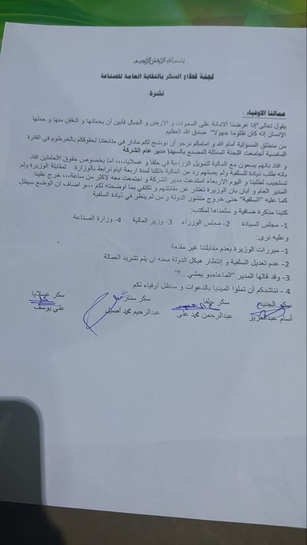 في مذكرة قوية (تحصلت عليها مسار ميديا) حملت نبرة تحذير واستغاثة، خاطبت لجنة قطاع السكر بالنقابة العامة لعمال الصناعة بالسودان أعلى مستويات الدولة، كاشفة عن أوضاع حرجة تهدد مستقبل صناعة السكر في البلاد، وسط تحديات التمويل وتأثيرات الحرب.