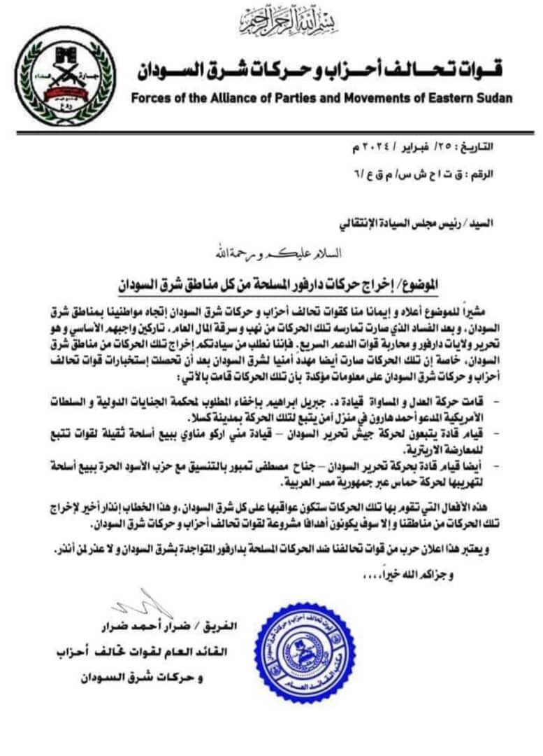 *الفريق ضرار أحمد ضرار يطالب مجلس السيادة بإخراج حركات دارفور المسلحة من شرق السودان *