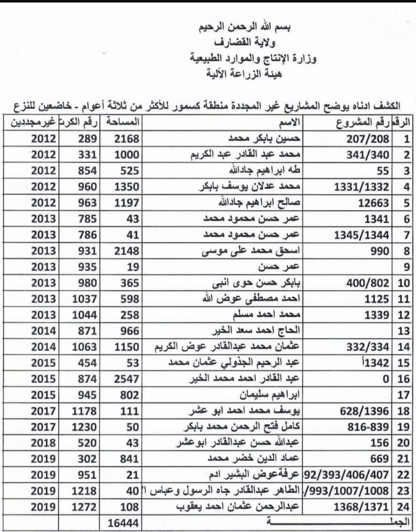 تعلن هيئة الزراعة الآلية بولاية القضارف، المزارعين، أدناه بمنطقة (كسمور)، بأن مشاريعهم خاضعة للنزع بسبب عدم التجديد لفترة تجاوزت أكثر من (ثلاث) سنوات، حيث تراوحت فترات عدم التجديد للمذكورين أدناه حسب الكشف المرفقة لفترة تراوحت بين (4_ 12) سنة.