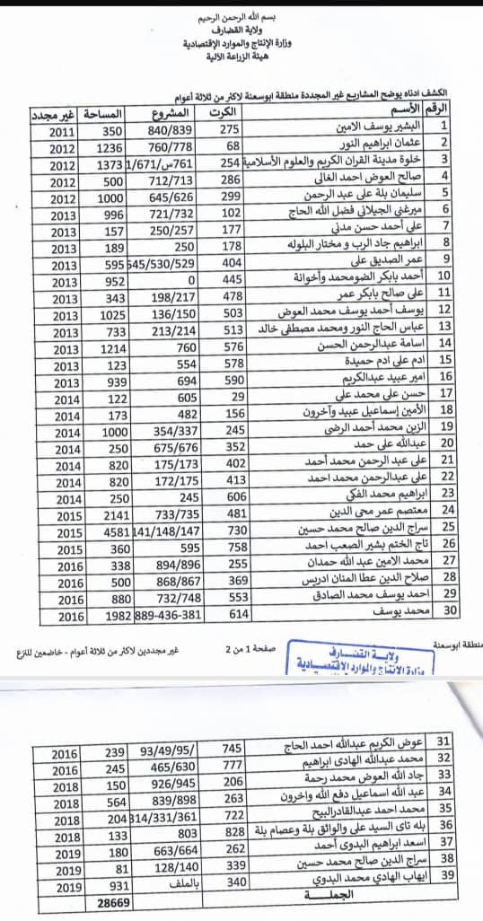 تعلن هيئة الزراعة الآلية بولاية القضارف، المزارعين، أدناه بمنطقة (أبو سعنة)، بأن مشاريعهم خاضعة للنزع بسبب عدم التجديد لفترة تجاوزت أكثر من (ثلاث) سنوات، حيث تراوحت فترات عدم التجديد للمذكورين أدناه حسب الكشف المرفقة لفترة تراوحت بين (4_ 13) سنة.