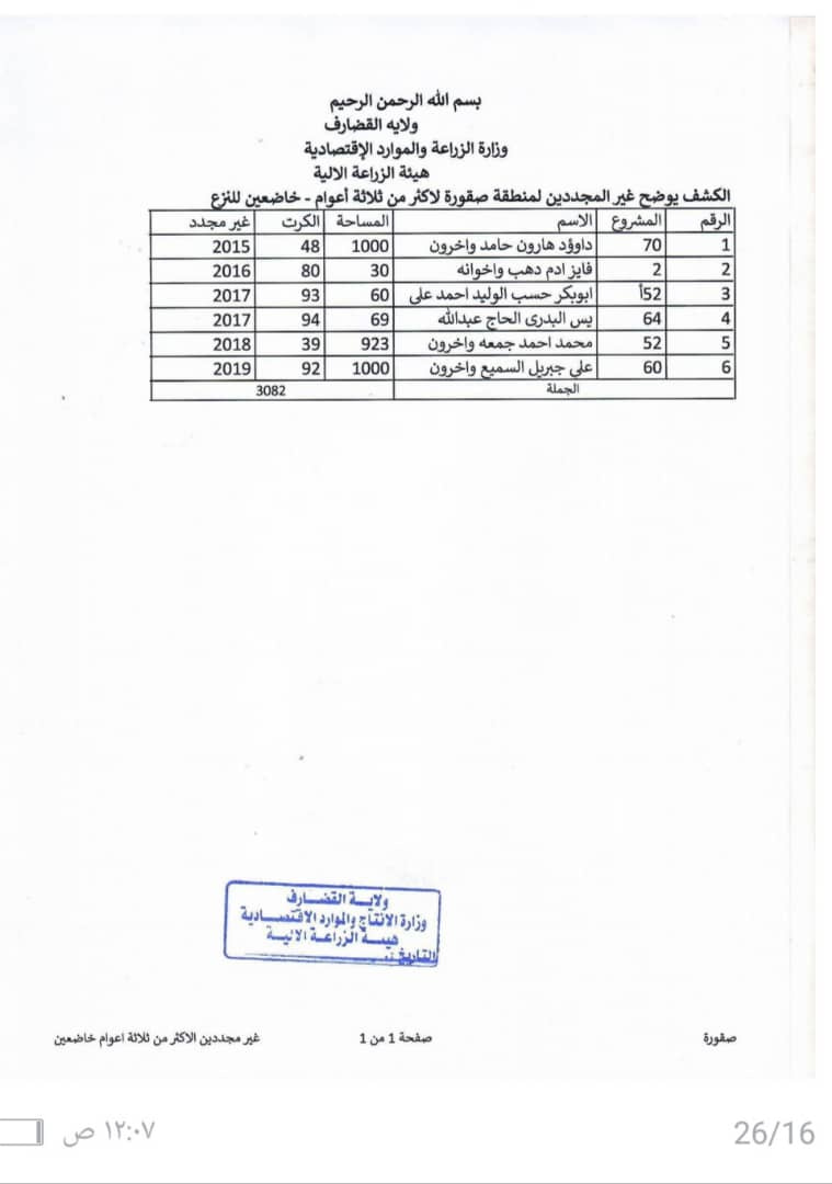 تعلن هيئة الزراعة الآلية بولاية القضارف، المزارعين، أدناه بمنطقة (العزازة صقوره)، بأن مشاريعهم خاضعة للنزع بسبب عدم التجديد لفترة تجاوزت أكثر من (ثلاث) سنوات، حيث تراوحت فترات عدم التجديد للمذكورين أدناه حسب الكشف المرفقة لفترة تراوحت بين (4_ 9) سنوات.