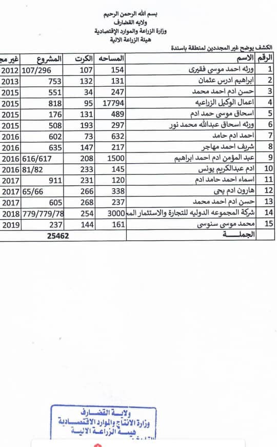 تعلن هيئة الزراعة الآلية بولاية القضارف، المزارعين، أدناه بمنطقة (باسندة)، بأن مشاريعهم خاضعة للنزع بسبب عدم التجديد لفترة تجاوزت أكثر من (ثلاث) سنوات، حيث تراوحت فترات عدم التجديد للمذكورين أدناه حسب الكشف المرفقة لفترة تراوحت بين (4_ 12) سنة.