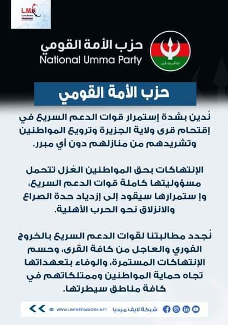 نُجدد مطالبتنا لقوات الدعم السريع بالخروج الفوري والعاجل من كافة القرى، وحسم الإنتهاكات المستمرة، والوفاء بتعهداتها تجاه حماية المواطنين وممتلكاتهم في كافة مناطق سيطرتها.