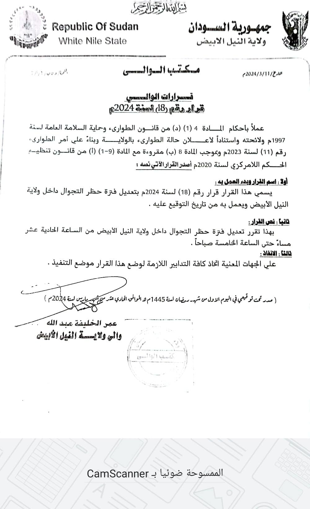 أصدر الاستاذ عمر الخليفة عبد الله والي ولاية النيل الابيض المكلف اليوم القرار رقم ثمانية عشر لسنة الفين وأربعه وعشرين بتعديل فترة حظر التجوال داخل الولاية من الساعة (الحادية عشر ) مساءاً وحتى الساعةا(لخامسة) صباحا