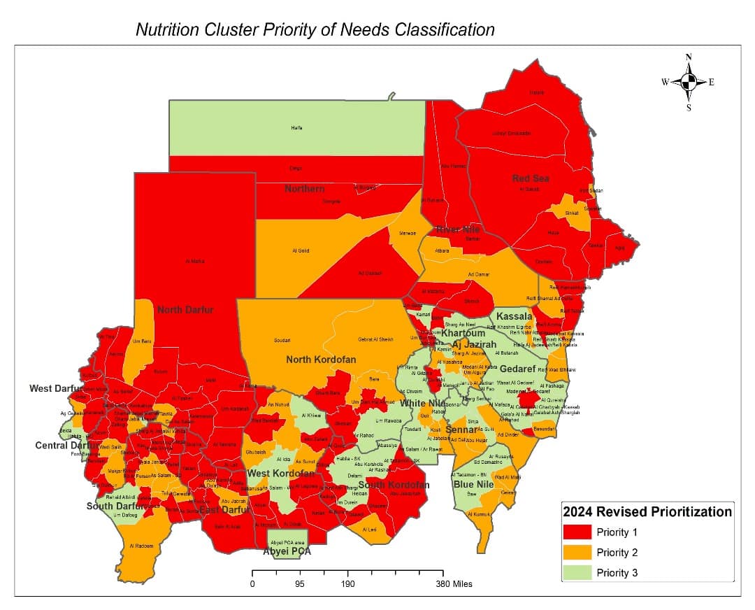 أدى التدهور الإضافي المتوقع لمسببات سوء التغذية الحاد إلى مراجعة قطاع التغذية للأشخاص المحتاجين لعلاج سوء التغذية الحاد بين الأطفال دون سن 5 سنوات والنساء والفتيات الحوامل والمرضعات. ارتفعت الحوجة من 3.9 مليون في فبراير 2023 إلى 4.9 مليون حالة متوقعة في فبراير 2024 للعام 2024 وهو أعلى تقدير في السنوات العشر الماضية، وأعلى بنسبة 22٪ مقارنة بتقديرات الربع الأول من عام 2023. مع تصنيف 93 محلية من أصل 189 محلية أولوية قصوى حسب مؤشرات سوء التغذية الحاد و وضع الامن الغذائي بالمحلية.