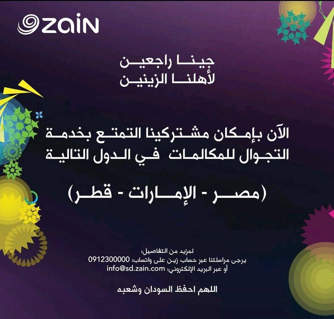 اعلنت الشركة السودانية للهاتف السيار ( زين ) عن عودة خدمة التجوال الدولي لمشتركيها في كل من جمهورية مصر، ودولتي قطر والامارات، يأتي ذلك ضمن المساعي التي تبذلها الشركة لاستعادة جميع خدماتها بعد تشغيل المقسم الرئيسي الجديد بمدينة بورتسودان في الثالث من مارس 2024، هذا اضافة لسعيها لاستعادة رقعة تغطيتها الاكبر في السودان.