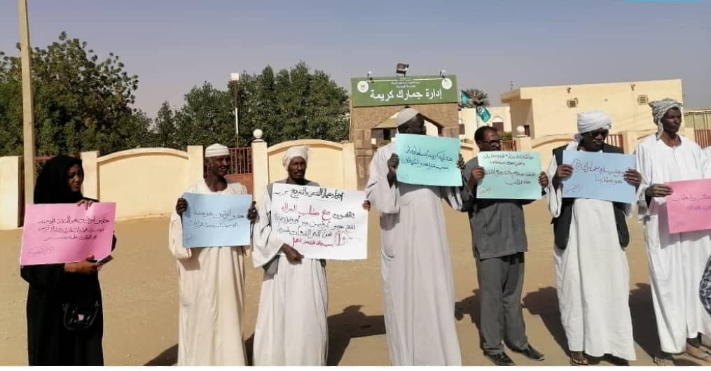 نظم عدد من المواطنين ووكلاء التخليص بمحطة جمارك كريمة بالولاية الشمالية وقفة إحتجاجية أمام محطة جمارك كريمة صباح اليوم الثلاثاء احتجاجا على مماطلة الإدارة العامة للجمارك السودانية في تنفيذ قرارات رئيس مجلس السيادة الفريق أول ركن عبد الفتاح البرهان والقاضية بتفعيل محطة جمارك كريمة، وتوريد السلع والبضائع عبر المحطة من معبري أرقين وأشكيت على الحدود بين السودان ومصر، لإنهاء التكدس الذي يحدث من حين لآخر بالمعابر الحدودية، ورفد الخزينة العامة للدولة بالايرادات.