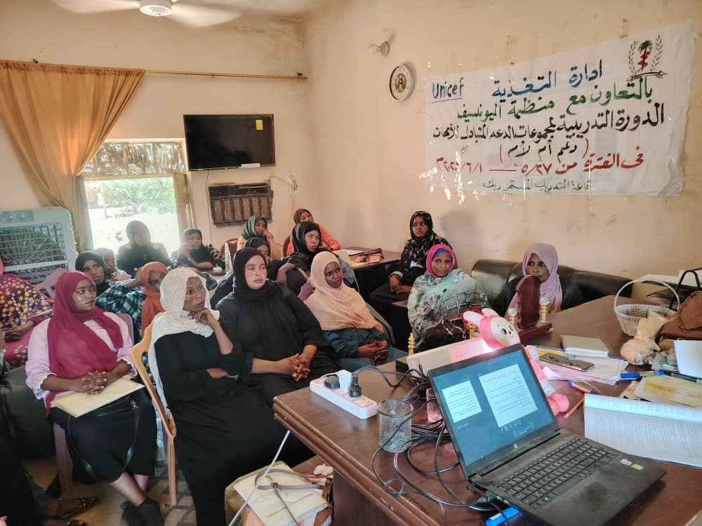 نظمت وزارة الصحة والتنمية الاجتماعية ممثلة في ادارة التغذية بالتعاون مع منظمة اليونسف الدورة التدريبة لمجموعات الدعم المتبادل للامهات ( دعم ام لام ) وقد اوضحت حنان ادم الدومة مدير ادارة التغذية ان ادارتها تنفذ عدد ثلاثة دورات تدريبية تستهدف ٩٠ ام بجميع محليات الولاية واشارت الي ان الهدف من الدورة تمليك الامهات المعلومات والمهارات لتحسين ممارسات تغذية الرضع وصغار الاطفال واكدت مدير التغذية اهتمام ادارتها بالتدريب من اجل رفع كفاءة الكوادر ان المرحلة القادمة تشهد تنفيذ عدد من البرامج وقالت ان الدورة تستمر لمدة ٥ ايام وتشهد التدريب العملي والنظري مشيدة بالدعم المتواصل لمنظمة اليونسف لانشطة وبرامج التغذية مما اسهم في نجاحها وثمنت الدعم المتواصل من وزير الصحة ومتابعتة لكل انشطة التغذية