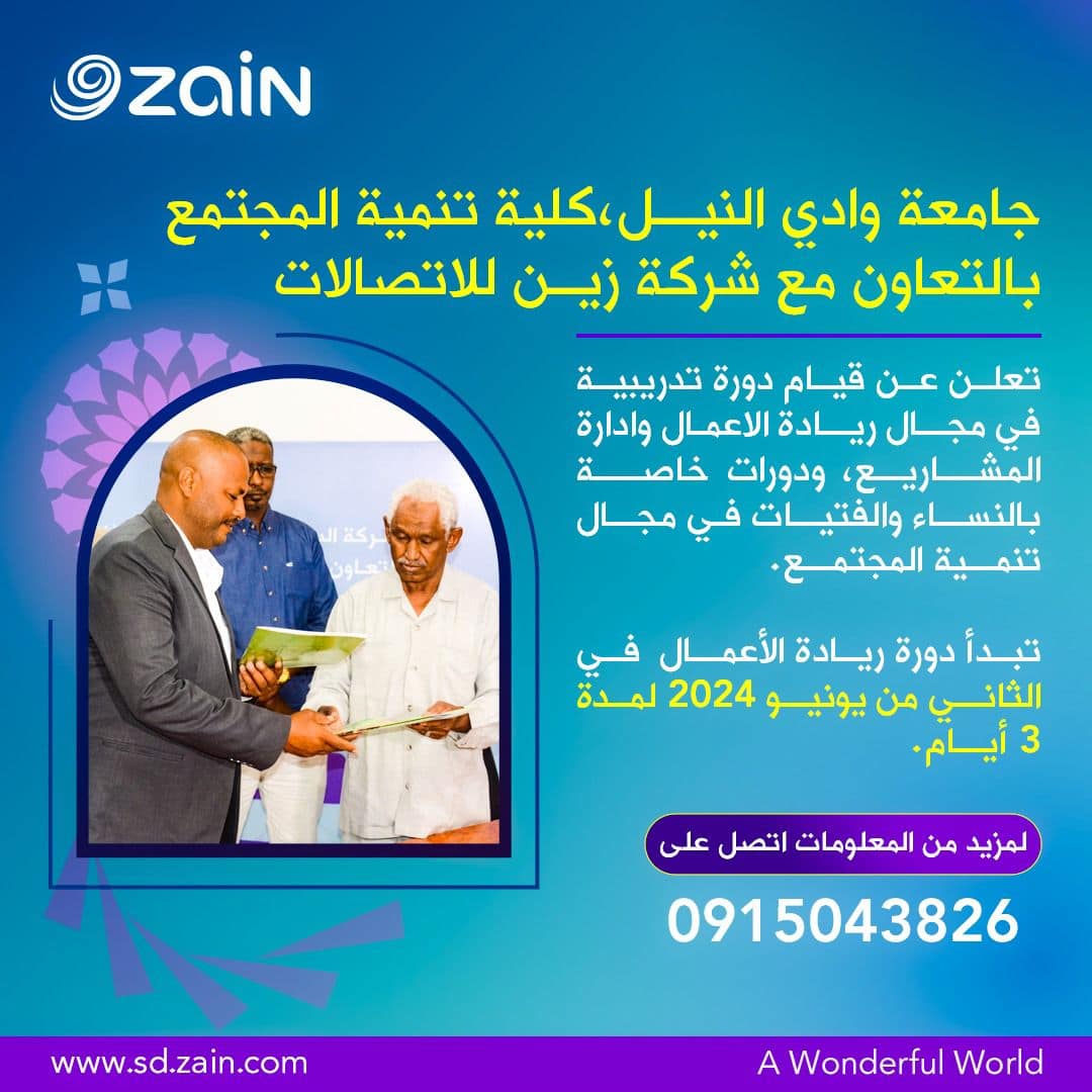 يذكر ان شركة زين وقعت مع جامعة وادي النيل مذكرة تفاهم يتم بموجبها دعم مشاريع تدريب الشباب والنساء لتمكينهم من والاستفادة من قدراتهم وصقلها بالمعرفة العلمية التى تمكنهم من اداء اعمالهم بصورة احترافية علما بأن الولاية قد شهدت في الفترة الاخيرة نزوح اعداد كبير من الشباب والأسر، صاحب هذا النزوح ظهور كثير من المشاريع الصغيرة ممادفع الشركة للعمل على توفير فرص للتدريب في مجال ريادة الاعمال حرصا منها على الاهتمام بكل شرائح المجتمع .
