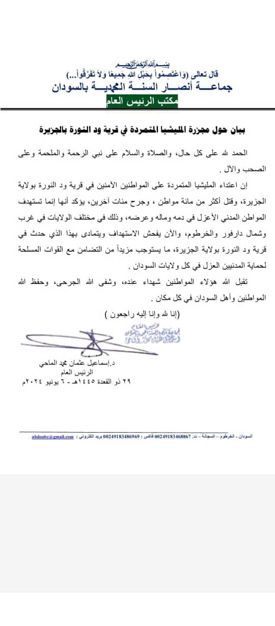إن اعتداء المليشيا المتمردة على المواطنين الآمنين في قرية ود النورة بولاية الجزيرة ، وقتل أكثر من مائة مواطن ، وجرح مئات آخرين ، يؤكد أنها إنما تستهدف المواطن المدني الأعزل في دمه وماله وعرضه ، وذلك في مختلف الولايات في غرب وشمال دارفور والخرطوم ، والآن يفحش الاستهداف ويتمادى بهذا الذي حدث في قرية ود النورة بولاية الجزيرة ، ما يستوجب مزيداً من التضامن مع القوات المسلحة لحماية المدنيين العزل في كل ولايات السودان .