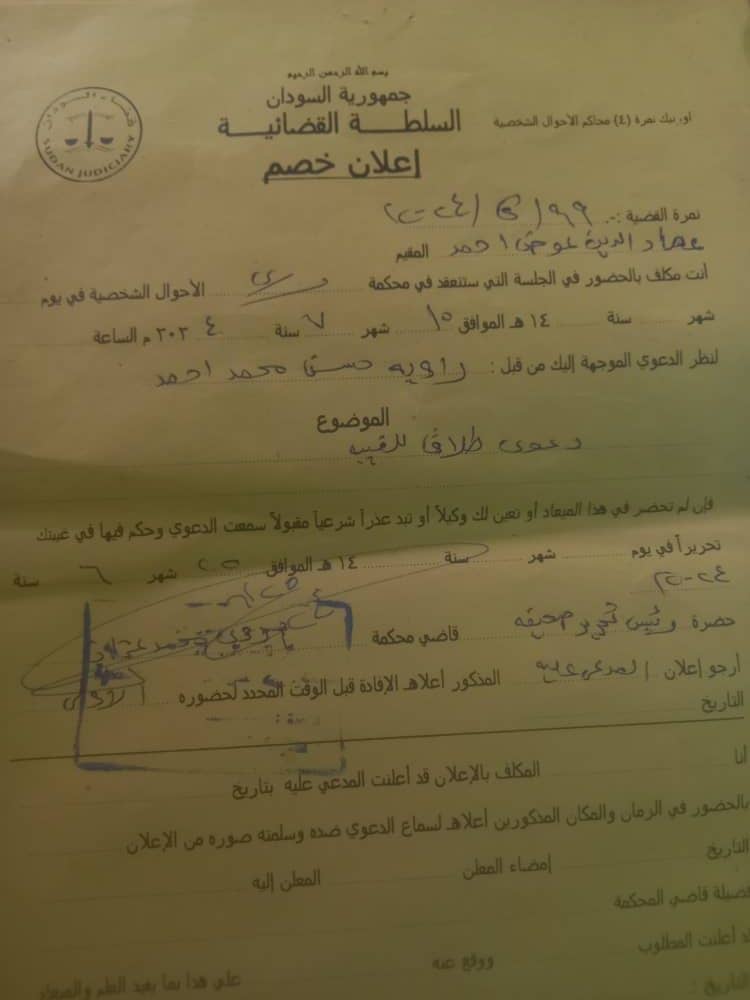 عماد الدين عوض أحمد، انت مكلف بالحضور في الجلسة التي ستنعقد في محكمة مروي للأحوال الشخصية يوم ١٥/ ٧/ ٢٠٢٤م