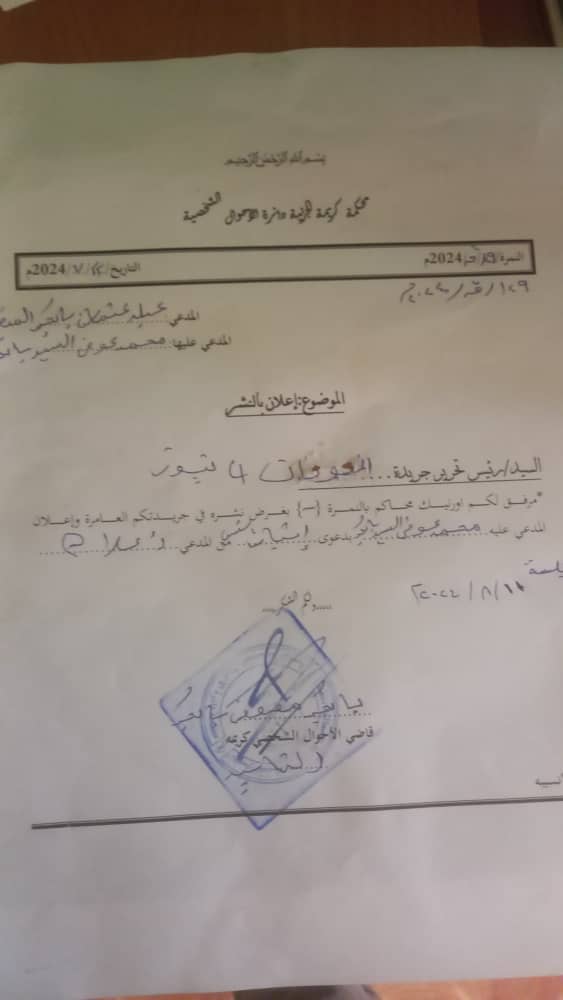 محمد عوض السيد بابكر . انت مكلف بحضور جلسة ١١ / ٨ /٢٠٢٤م لنظر الدعوى الموجهة إليك من قبل : عبلة عثمان بابكر المنصوري / دعوى إثبات نسب