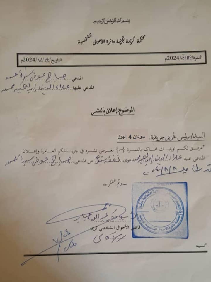 علاء الدين ابراهيم محمد . انت مكلف بحضور جلسة ٨ / ٨ /٢٠٢٤م لنظر الدعوى الموجهة إليك من قبل : صباح عوض سيد احمد/ دعوى نفقة بنوه