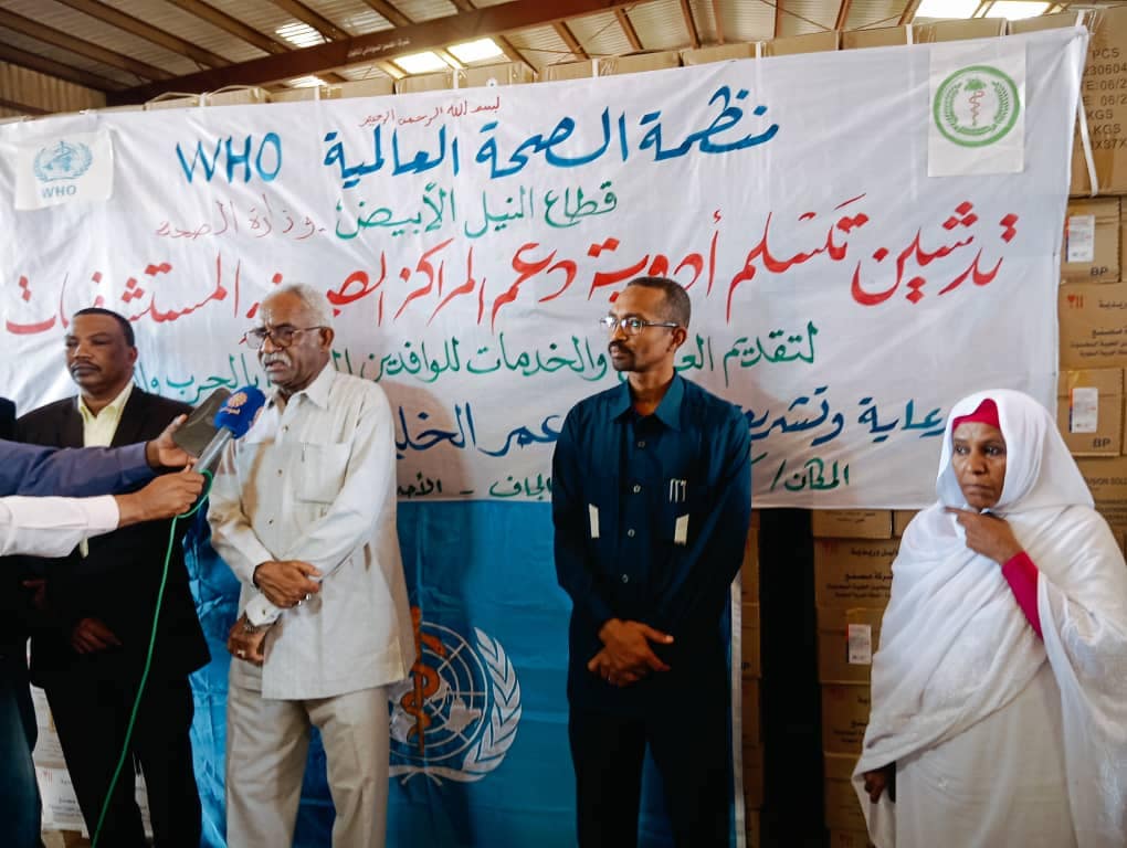 من جانبة اشار الدكتور عبداللطيف محجوب ممثل منظمة الصحة العالميه قطاع النيل الابيض الي جهود المنظمة لدعم المراكز الصحية والمستشفيات بالولايه بالتنسيق مع وزارة الصحة والتأمين الصحي والرامية لتقديم خدمات صحية مستقرة خاصة للوافدين المتاثرين بالحرب والنزوح مشيرا الي أن كل المعينات والأدوية التي تم تدشينها تستهدف عدد ثمانية مراكز صحية ومستشفي كوستي وربك وتتواصل برامج المنظمة لدعم القطاع الصحي بالولايه