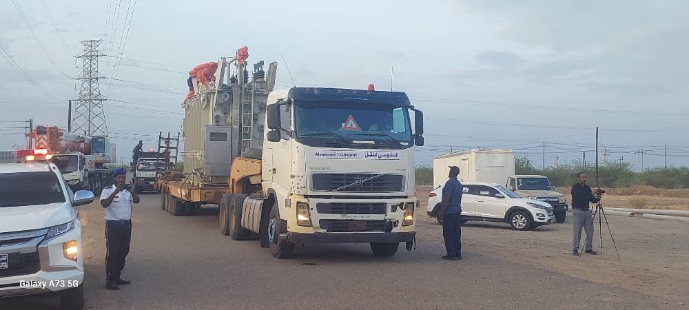 بحضور وزير الطاقة والنفط د.محي الدين نعيم محمد سعيد ومدير عام كهرباء السودان القابضة المهندس عبدالله أحمد محمد يقفون على عمليات وصول المحول والاجزاء المكملة له.