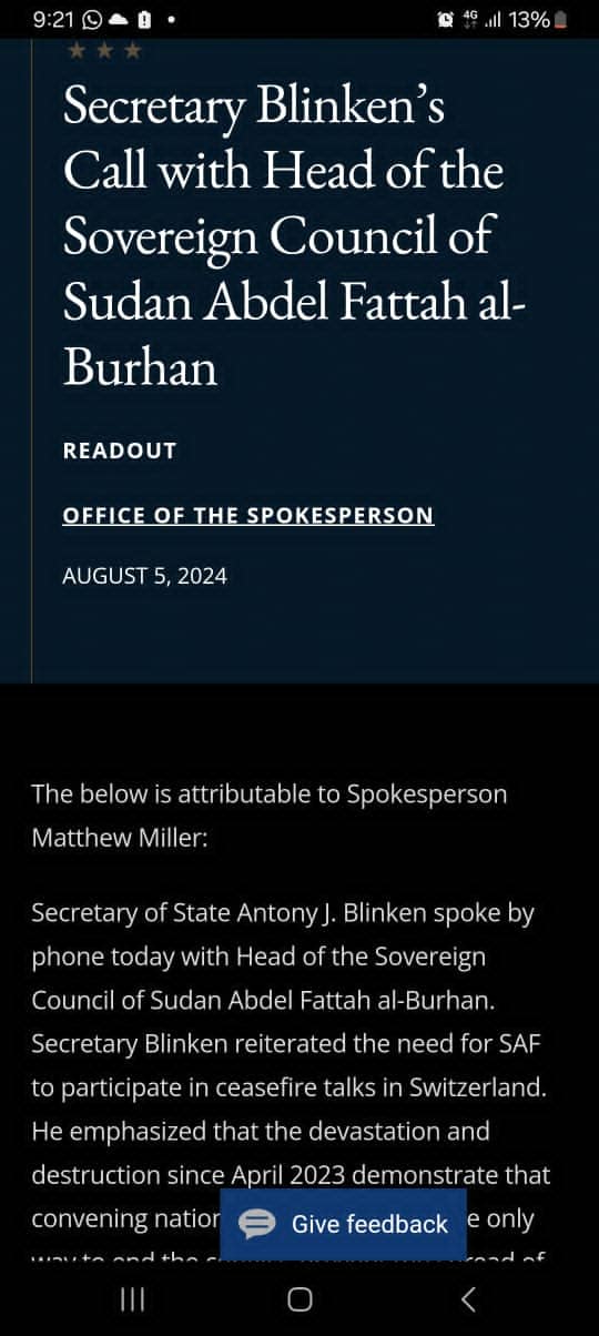 كشف بيان للمتحدث باسم الخارجية الأمريكية ماثيو ميلر عن مكالمة هاتفية جرت اليوم الاثنين بين وزير الخارجية أنتوني بلينكن مع رئيس المجلس السيادي بالسودان عبد الفتاح البرهان في سابقة تعد الاولى من نوعها منذ الحرب تمثلث في مخاطبة الادارة الامريكية للفريق اول عبد الفتاح برهان بوصفه رئيس مجلس السيادة السوداني وقال ميلر في بيانها الذي حوى ذلك ان ” بلينكن شدد على أن الدمار منذ أبريل 2023 يبرهن على أن عقد محادثات وقف إطلاق النار هي السبيل الوحيد لإنهاء الصراع ومنع انتشار المجاعة واستعادة العملية السياسية المدنية” واضاف ات الوزير شدد على ” الحاجة إلى وضع حد عاجل للقتال وتمكين وصول المساعدات الإنسانية دون عوائق، بما في ذلك عبر الحدود وعبر الخطوط للتخفيف من معاناة الشعب السوداني”.